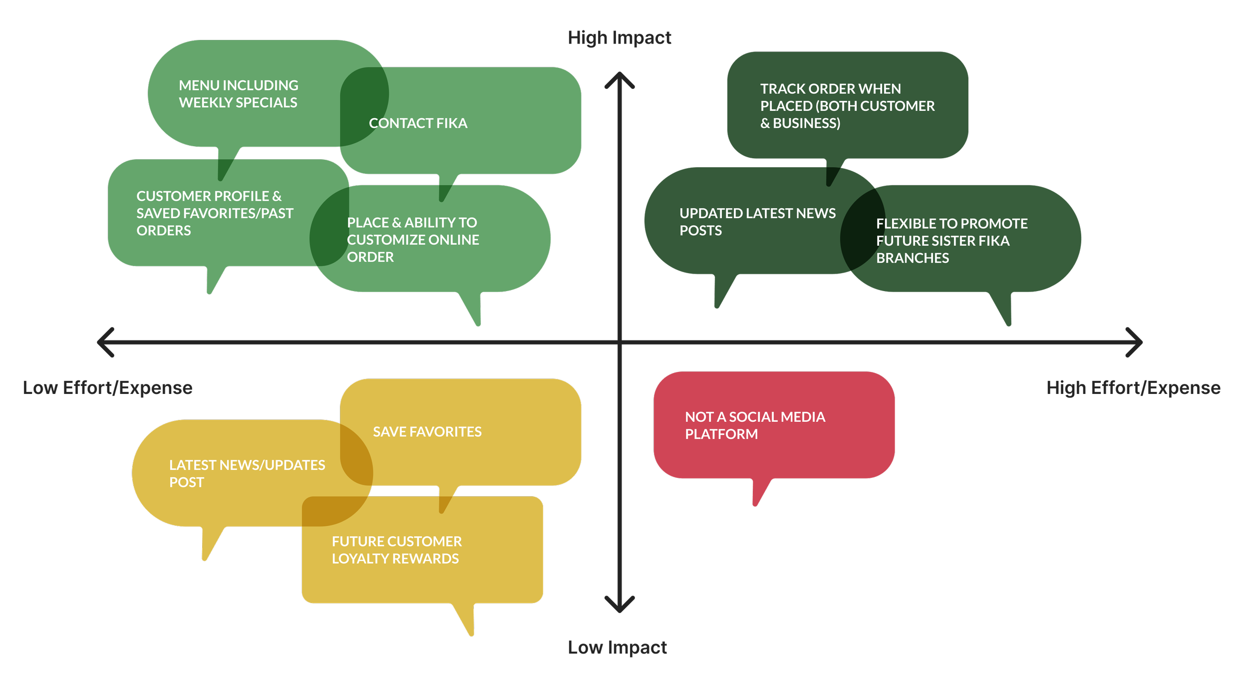 Considering Zane’s needs and goals alongside overall user and ownership expectations, I collaborated with Fika’s teams to establish a hierarchy of features to be developed and not.