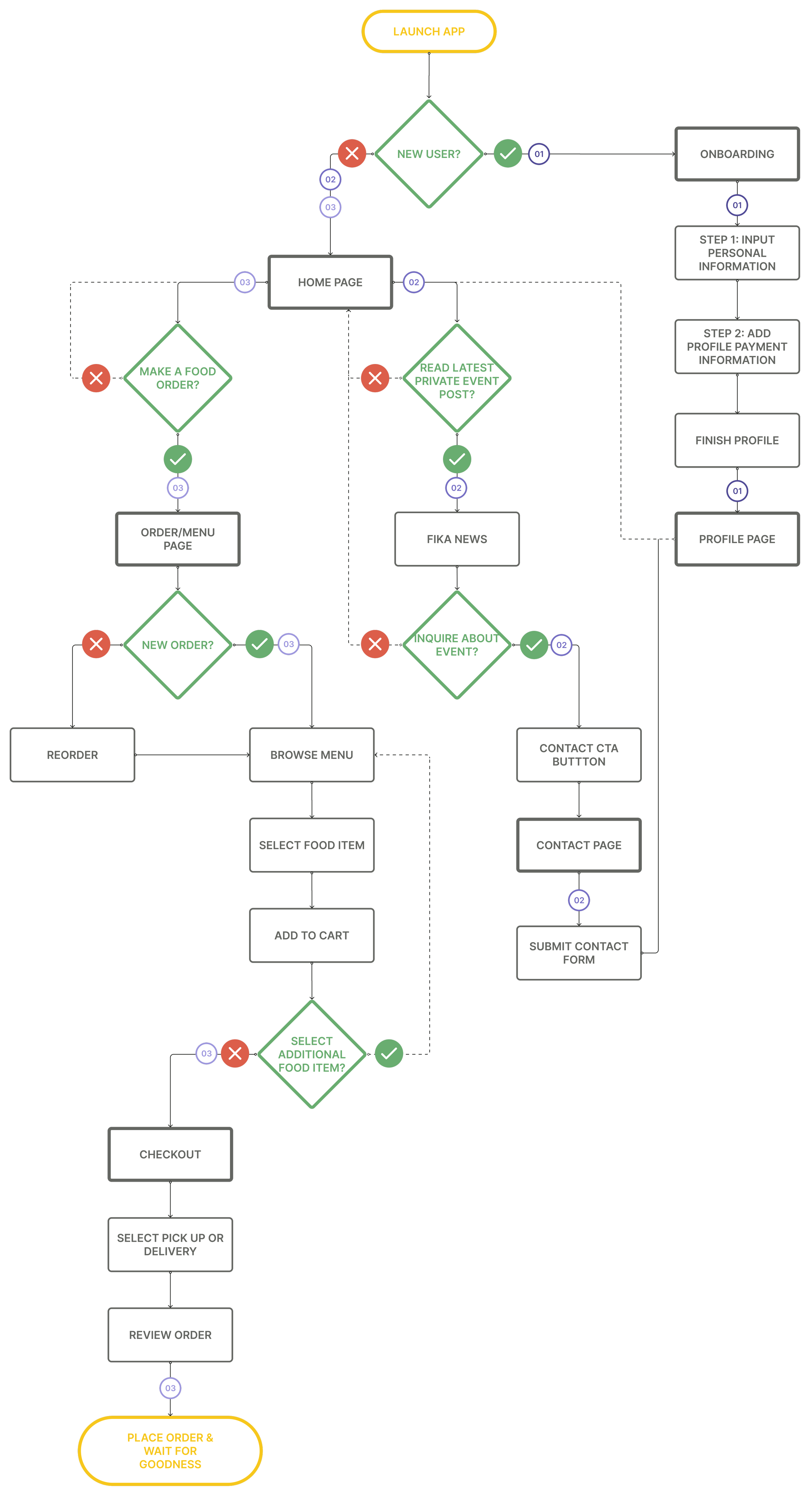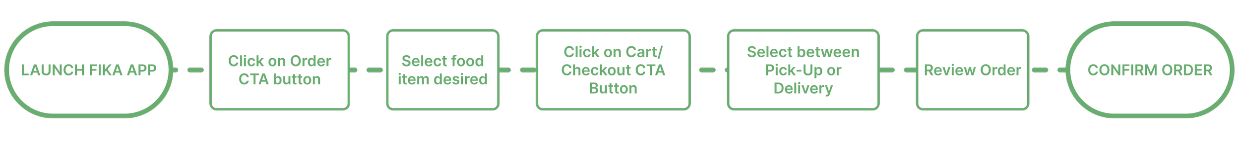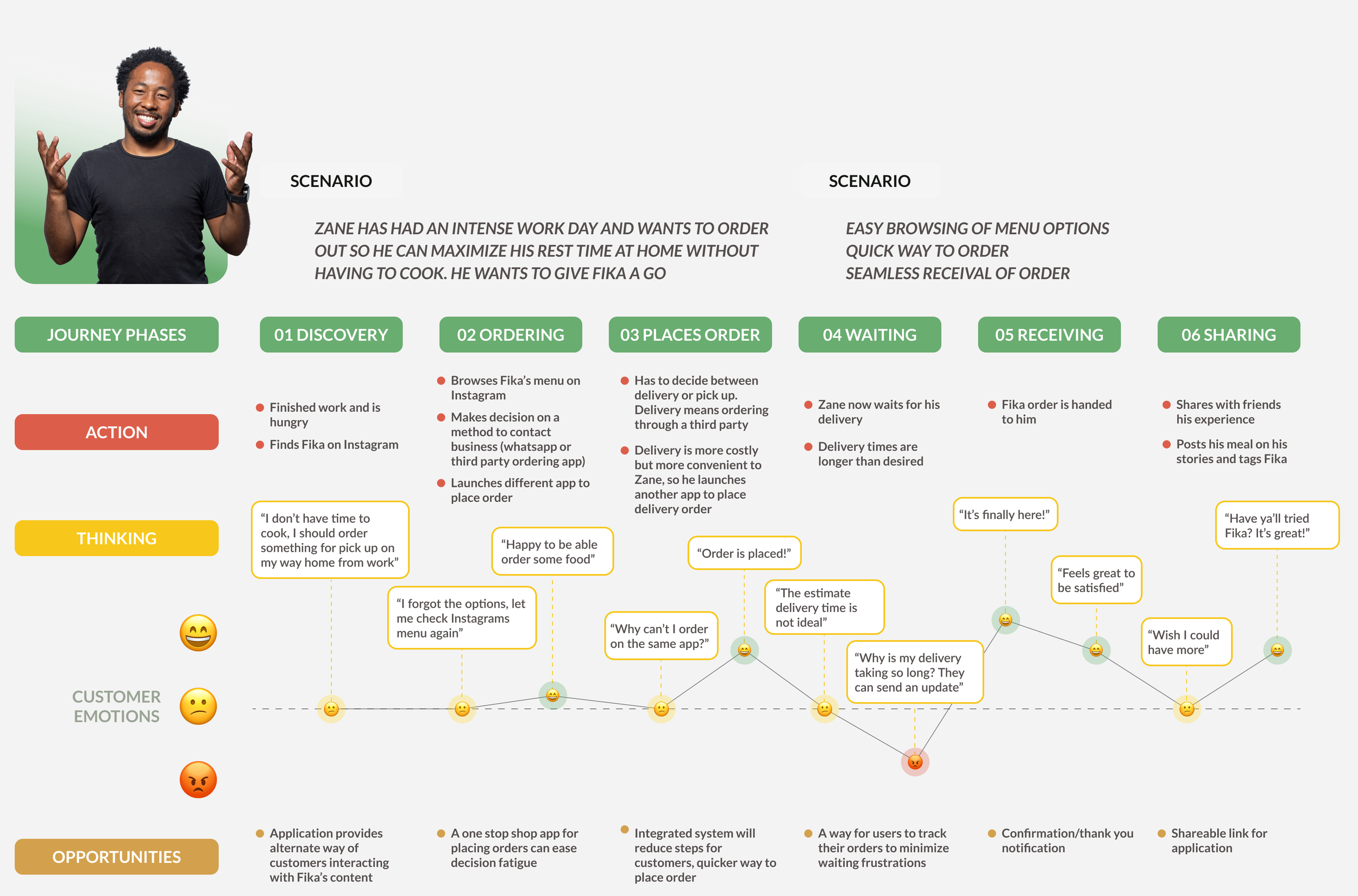 Diving deeper into our persona’s purchasing behaviors, the journey map delineates the timeline of how customers currently place an order with Fika