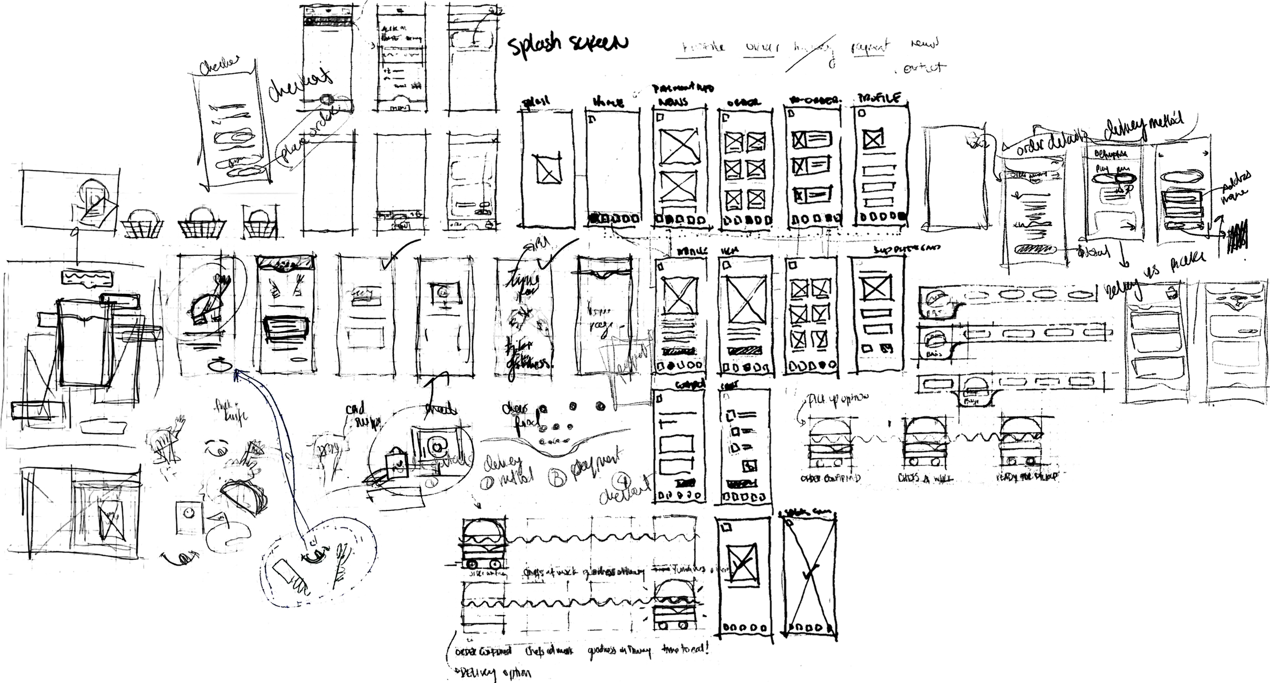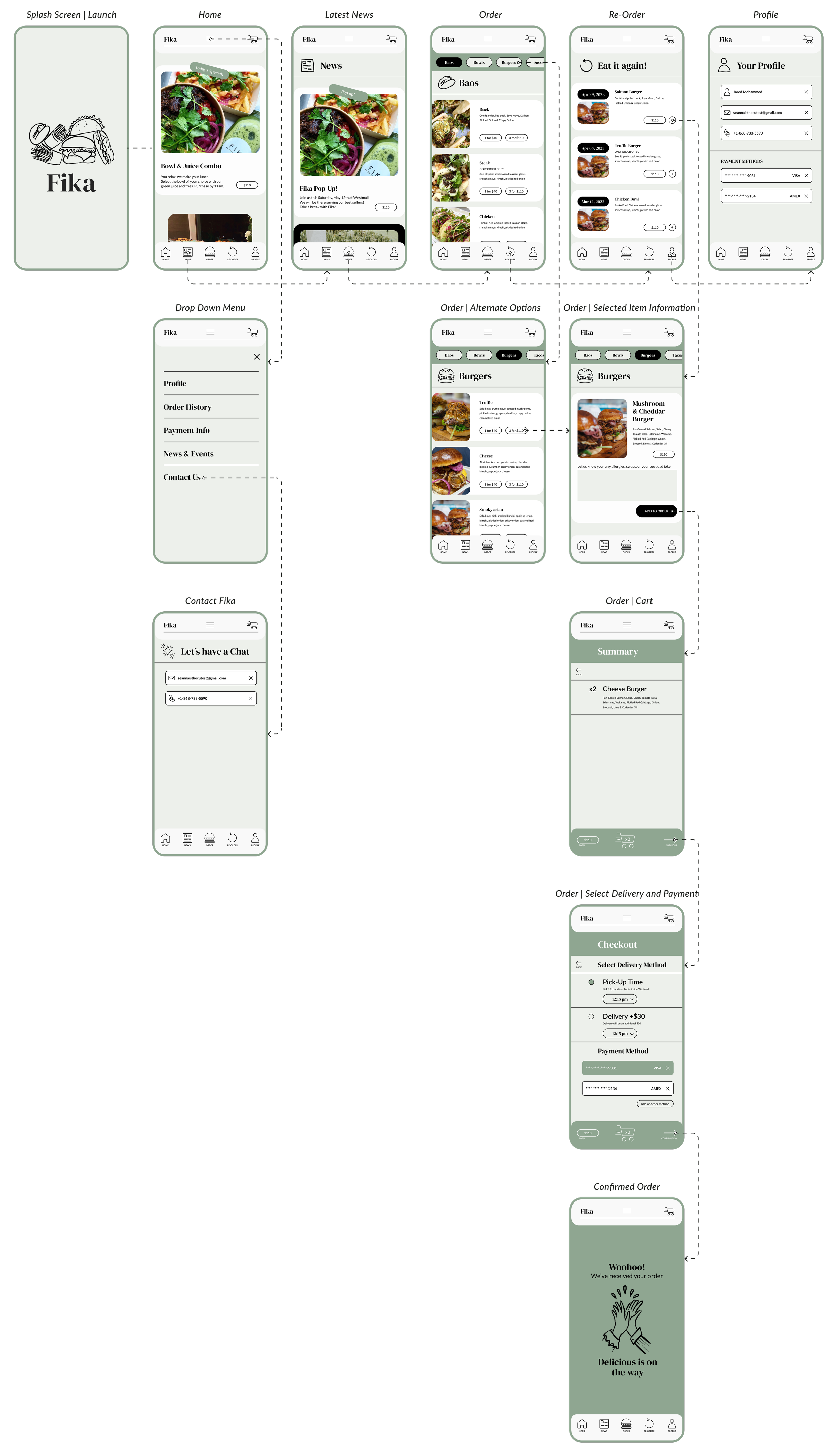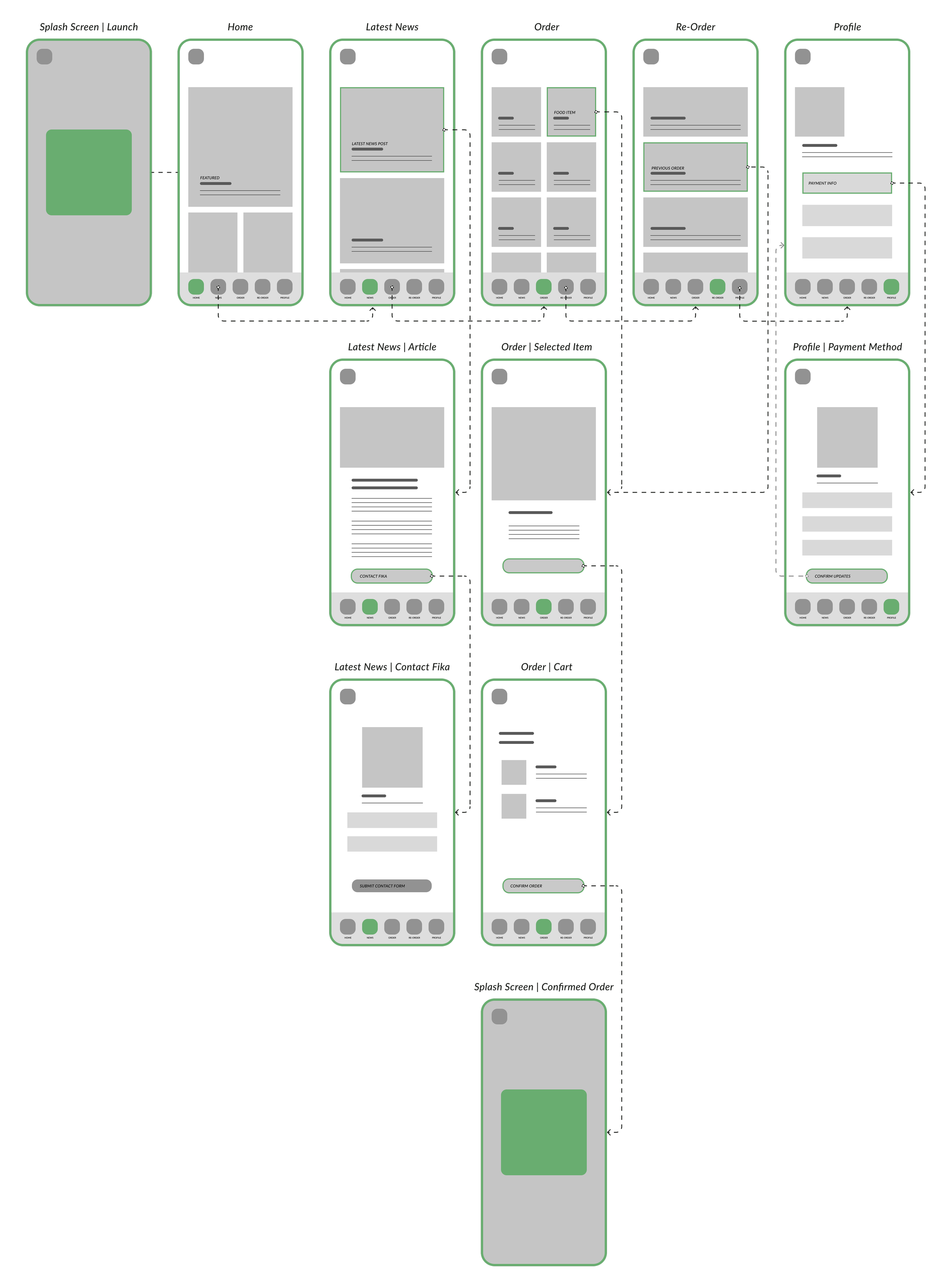 Establishing the primary elements to be placed on the navigation bar early on helped set the structure of the application. This was derived through continuous communication with Fika’s teams ensuring that their concerns also aligned with user’s needs. In this iteration we focused on the sequence of placing an order.