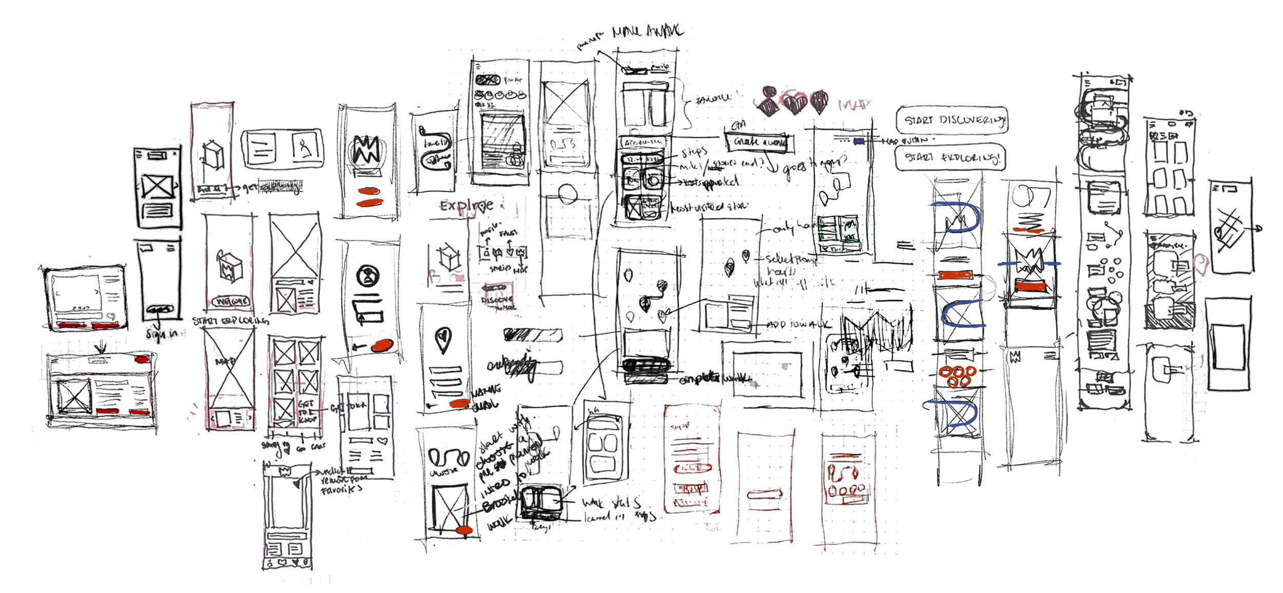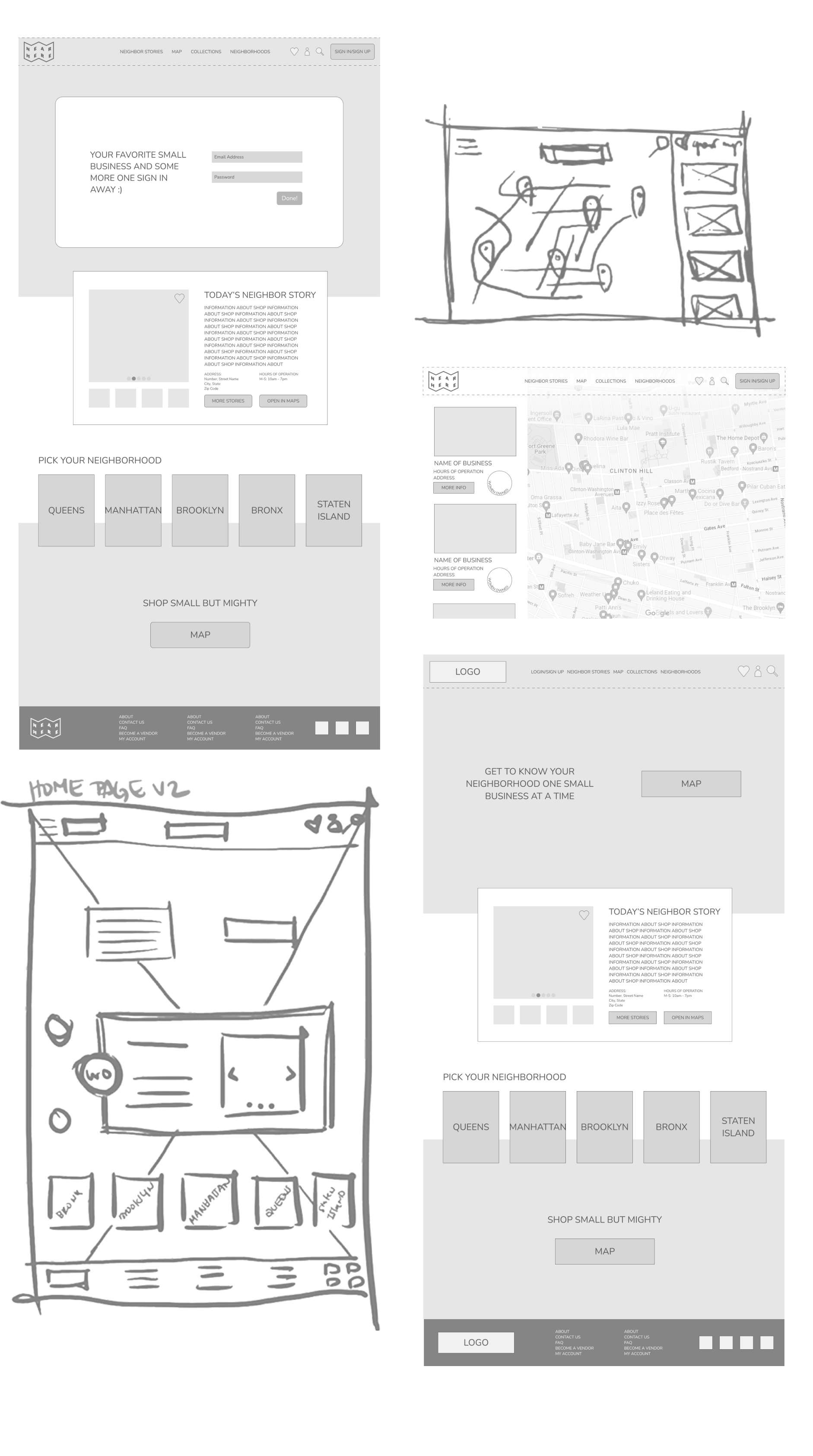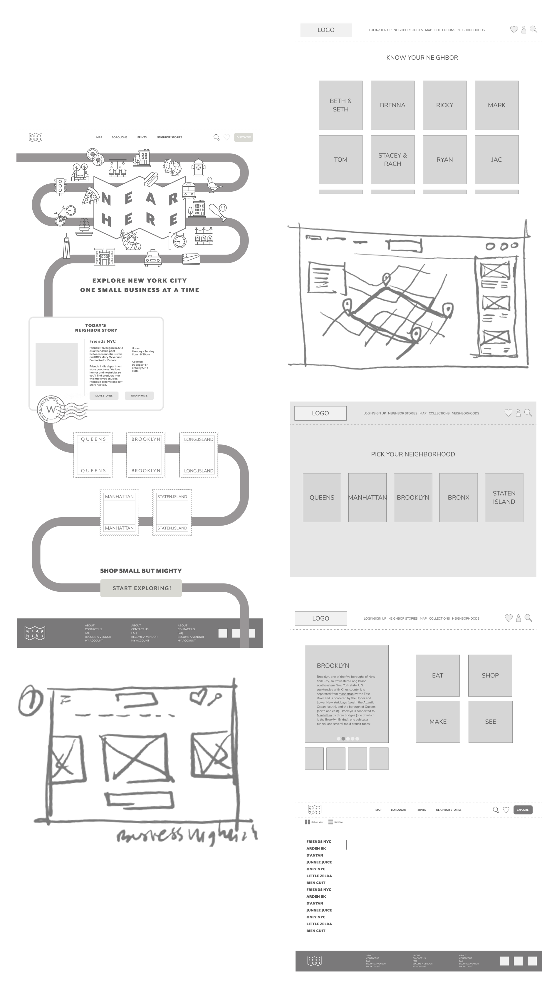 I began sketching what Elena’s user flow could start to look like and developed them into low fidelity wireframes for a web based resource. Through this identifying the priorities established throughout the research, like including an interactive map as the main way to see stores as well as featuring “today’s vendor story” that highlights the background of a vendor in NYC.