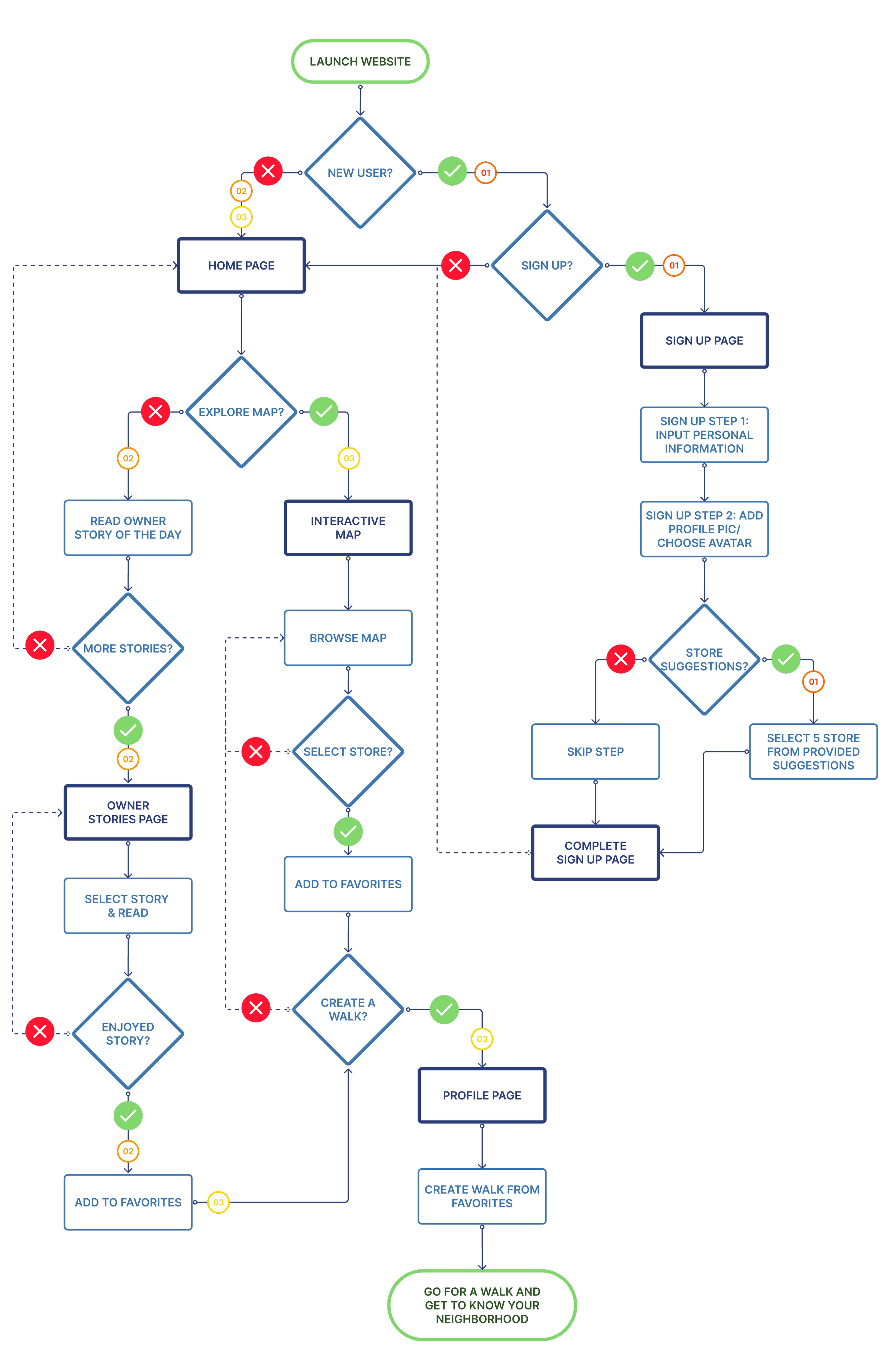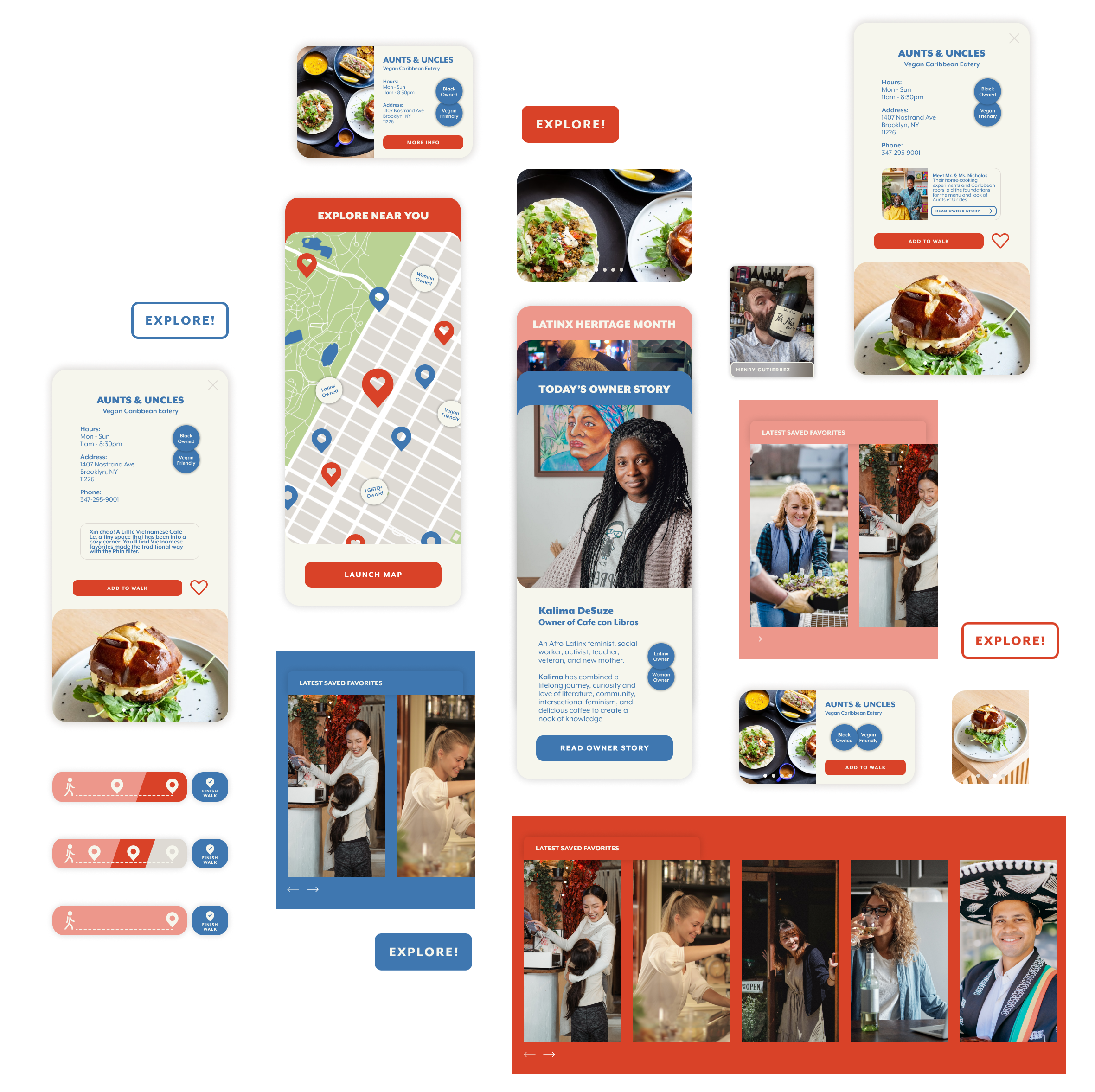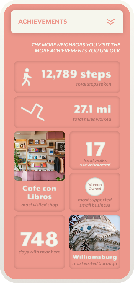 Giving your favorites a playful remake. I wanted users to not only be able to create a walk they can go on along or share with friends but also see the impact of these walks. How many women owned businesses you’ve visited? How many walks have you done? How owners you’ve gotten to know? You get to see how much you’ve achieved as a Near Here user.