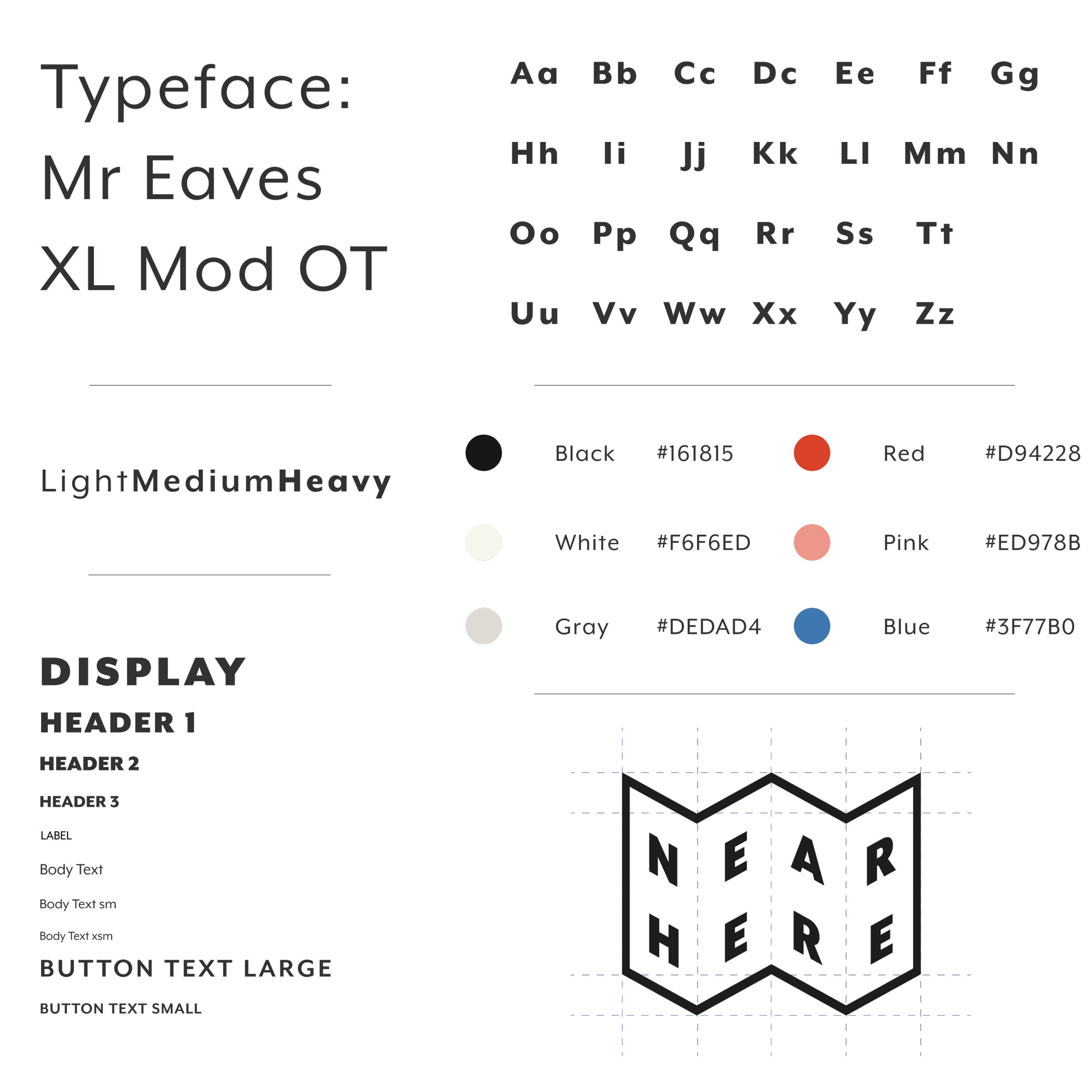 I refined Near Here’s style guide. After embracing the data and design revisions I wanted to polish the bases of the UI. I chose a typeface that was flexible and consistent and using user feedback to choose the colors. Ensuring the style guide benefits the user interactions rather than muddle as in the previous wireframe and prototype. The logo was designed based on a physical folding map, paying homage to how we used to get around.