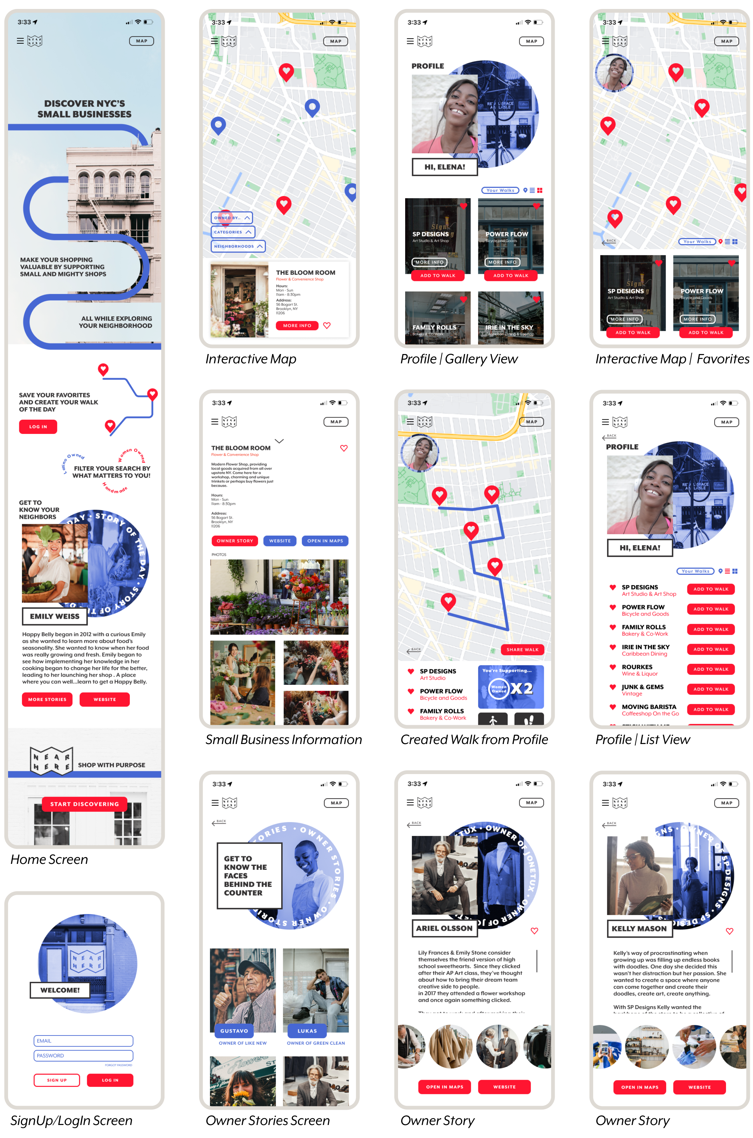 Mobile app concept design for Near Here. A case study that adds meaning to how you get to know New York City as you support small businesses. Shop local and get to know your neighbors.