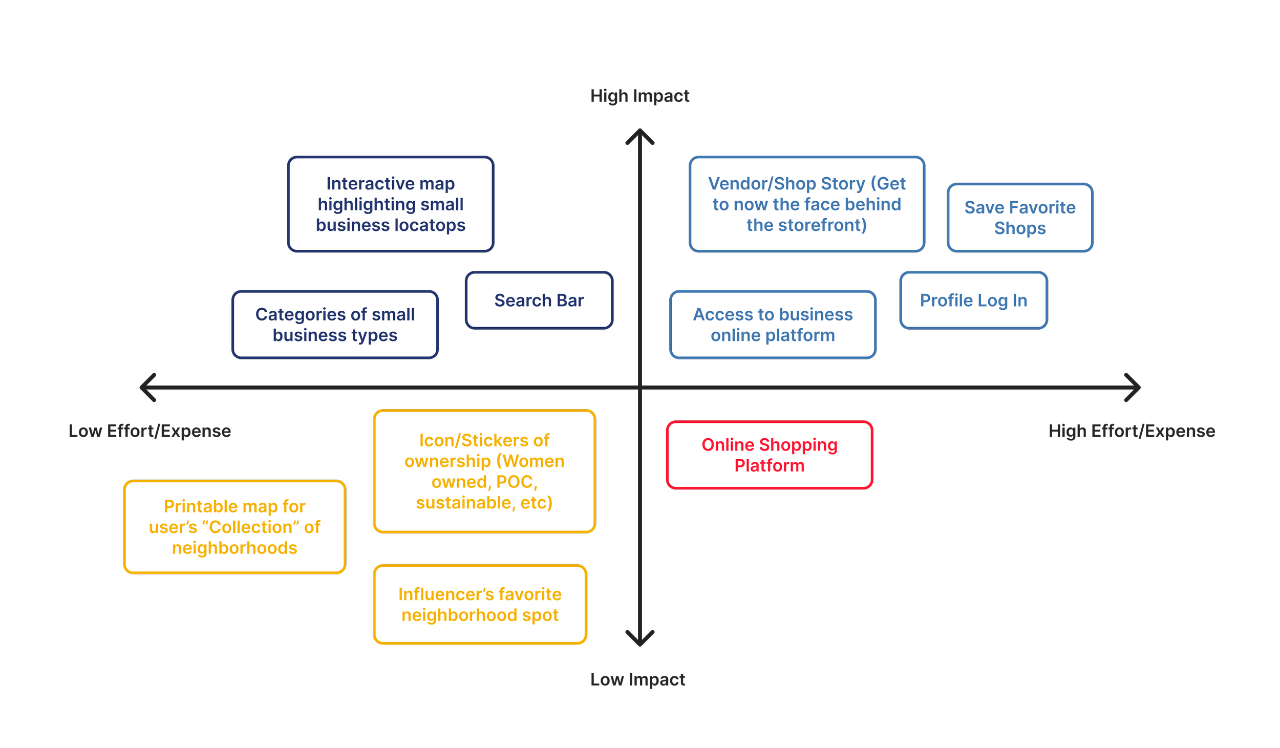 Using an analysis affinity map I categorized each data point and began to see clear themes. I started to be able to empathize with the user’s pain points and hopeful solutions in their shopping and neighborhood exploring journeys. How can these two subjects successfully intersect?